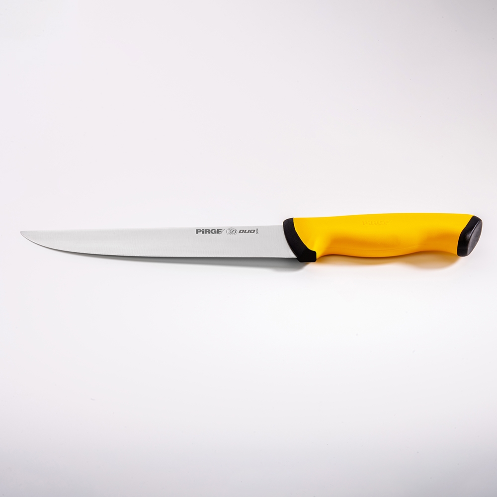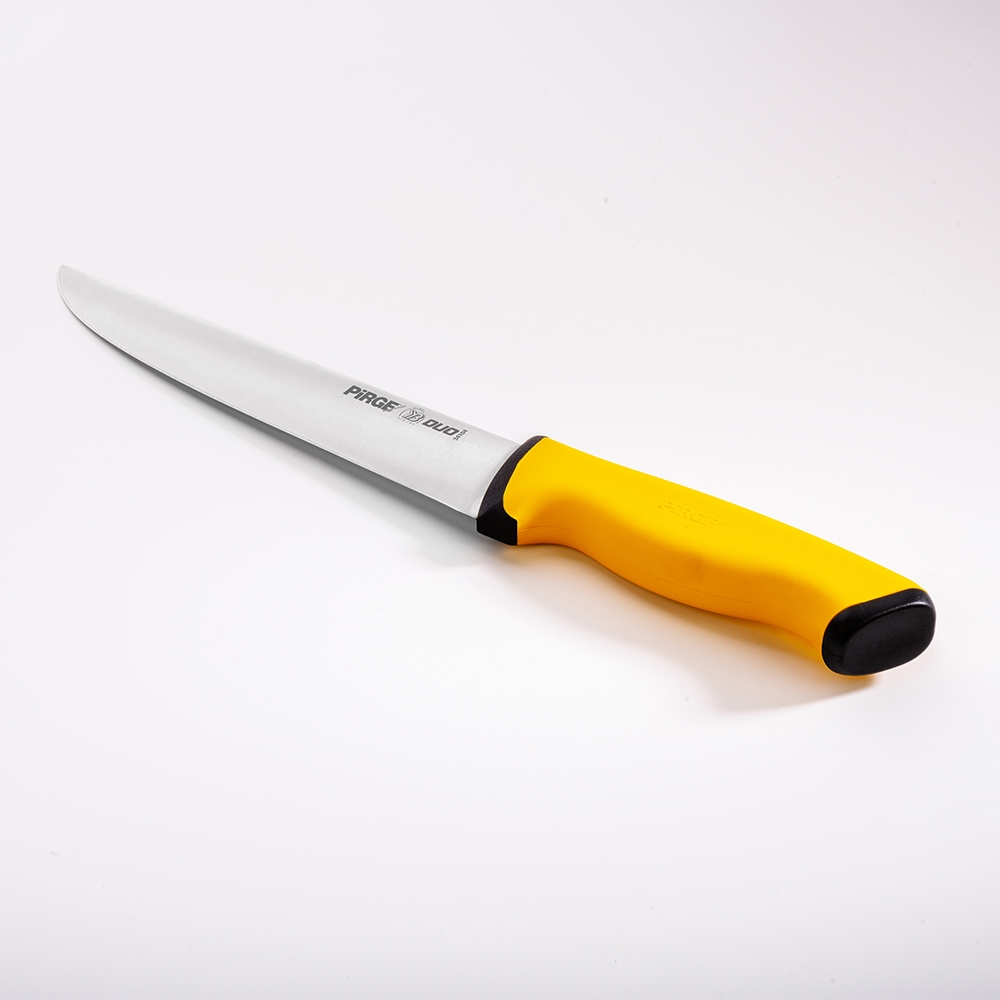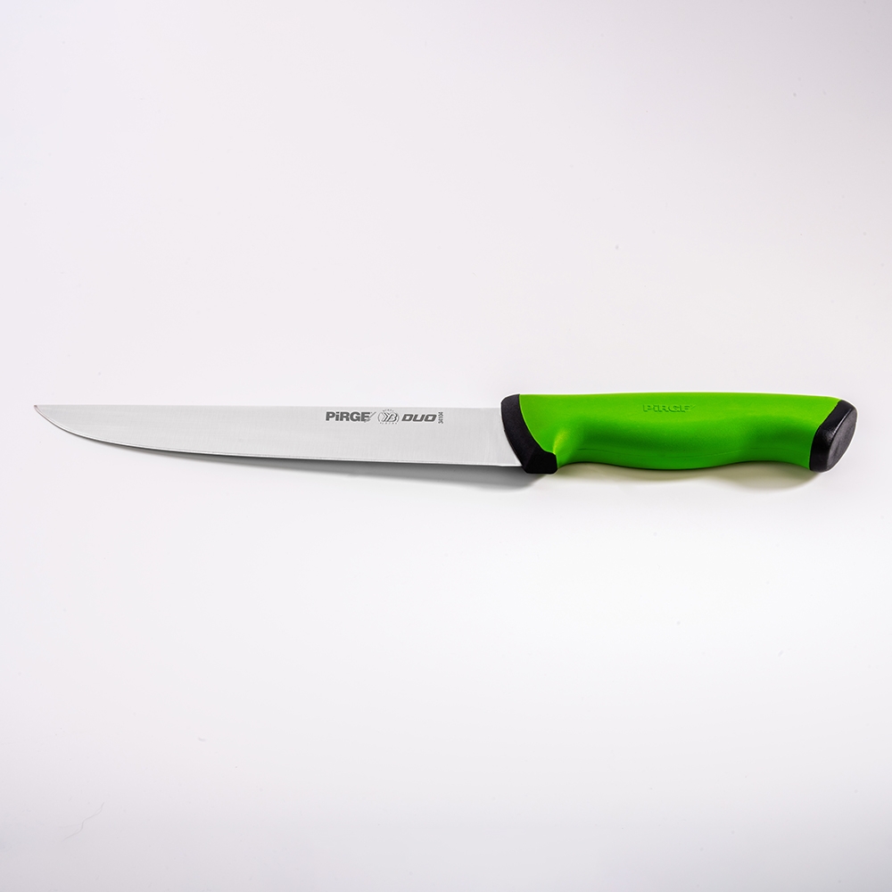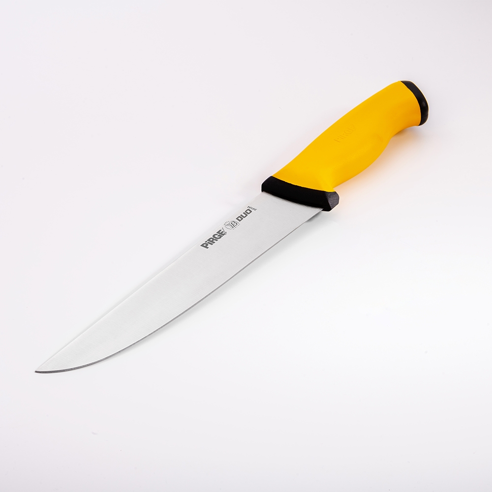 Duo Kasap Bıçağı No.4 21 cm ürünümüz güçlü çelik yapısı, üst kısımda kullanılan özel plastik sayesinde yumuşak ve kaymayan bir tutuş, iç kısımda kullanılan sert plastik sayesinde hijyen ve sağlamlık sağlayan sap kısmı sayesinde zorlu işlerin üstesinden kolaylıkla gelecektir! Kullanımınıza uygun bir ölçü, kalınlık ve sap modeli seçtiğinizden emin olun, etleri ve sebzeleri ne kadar rahat kestiğinizi gördüğünüzde bize hak vereceksiniz.