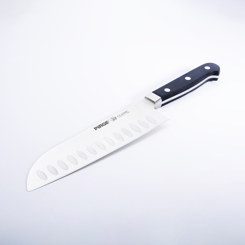 Gastro Santoku Bıçağı Oluklu 17 cm Uzak Doğu mutfak kültürünün vazgeçilmez Şef Bıçağı! Düz kesici kısmı ve dengeli yapısı sayesinde durmadan doğrayın. Tak tak tak! Oluklar ne işe yarayacak? Kestiğiniz malzemeler bıçak yüzeyine yapışmayacak ve sizi hiçbir şey durduramayacak.