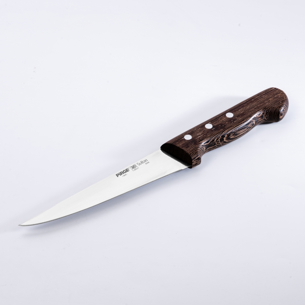 Sultan Kasap Bıçağı No.0 12,5 cm ürünümüz kalın ve güçlü çelik yapısı, doğal ahşap, üç perçinle sabitlenmiş sağlam sap kısmı sayesinde işlerinizi çok kolaylaştıracaktır! Kullanımınıza uygun bir ölçü, kalınlık ve sap modeli seçtiğinizden emin olun, etleri ve sebzeleri ne kadar rahat kestiğinizi gördüğünüzde bize hak vereceksiniz.