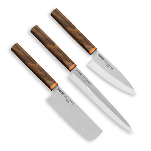 Titan East Uzakdoğu Mutfak Bıçak Setindeki bıçaklar ile Japon mutfağının felsefesini hissedip, önemli yemeklerini kolaylıkla yapabilirsiniz, Deba ile et ve balık doğrama, Nakiri ile sebze dilimleme, Yanagiba ile Suşi kesebilirsiniz.