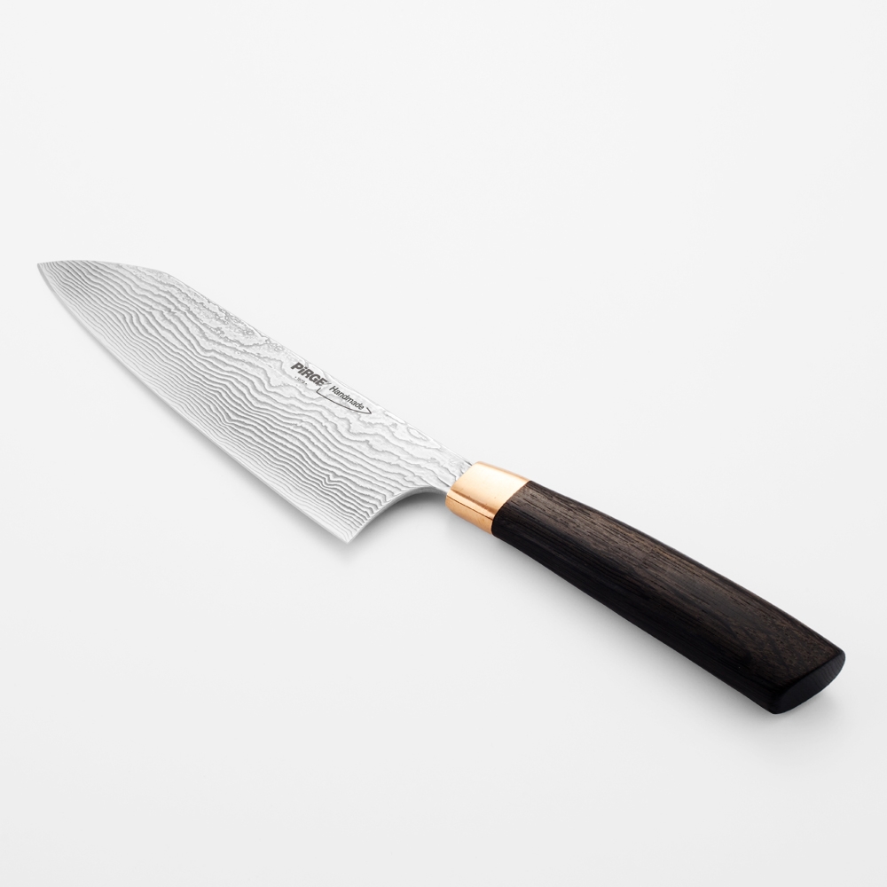 Pirge Handmade Damascus Şef Bıçağı 17 cm x KROP,135 katmanlı paslanmaz Damascus çeliği (Damax by Alleima) ve yaklaşık 1500 yıllık bog oak sap ile üretilen Handmade Damascus Şef Bıçağı, el işçiliği ve üstün malzemeleri bir araya getirir. Dengeli yapısı ve güçlü keskinliği sayesinde doğrama, dilimleme ve hazırlık işlemlerinde mutfakta yüksek performans sunar.