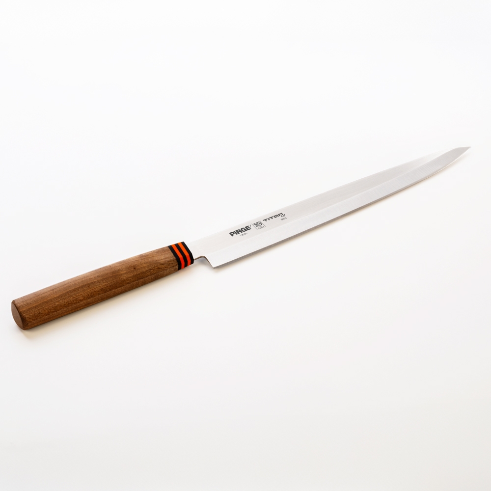 Titan East Suşi Bıçağı - Yanagiba 30 cm harika sarılmış suşilerin güzelce dilimlenmesi için tasarlanmıştır. Tek taraftan inceltilmiş güçlü çelik yapısı ve çok keskin ağzı ile parmaklarınızı koruyun. Dikkat bu ürün Sağ El ile kullanım için tasarlanmıştır.